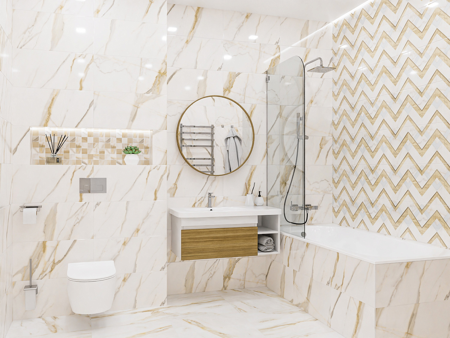 Для дизайнерских проектов реализован третий декор - APULIA ORO GEOMETRIA, комбинирующий текстуры мрамора и дерева. Этот декор отличается универсальностью стыковок, образуя при перевороте новые геометрические формы.