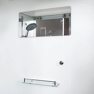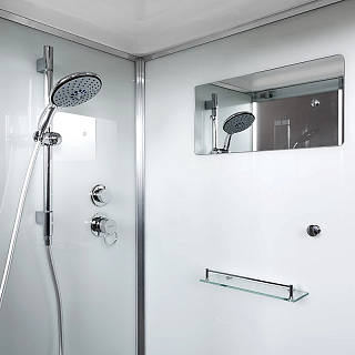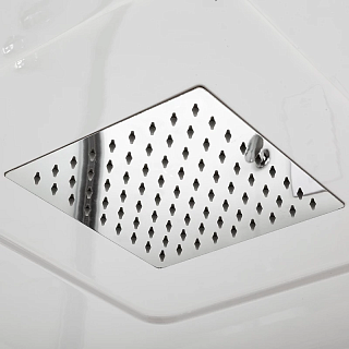 Душевая кабина комплектуется крышей, которая изготовлена из многослойного стеклянного полотна триплекса. В неё вмонтирована панель верхнего душа с силиконовыми форсунками. Имеется также лейка ручного душа со шлангом длиной 150 см. Что удобно, так он не скручивается даже при вращении на 360 градусов благодаря системе Anti-Twist.