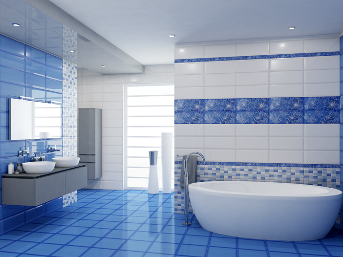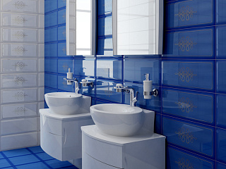 Глубокий синий цвет напольной и настенной плитки напоминает о морских глубинах. Такой же размер и цвет имеют декоры с золотистыми узорами, а также мозаичные вставки. Другой вариант настенной плитки – светло-бежевый, есть и мозаика в том же оттенке. Украсят интерьер панно с цветами белыми по синему фону и темными по бежевому.