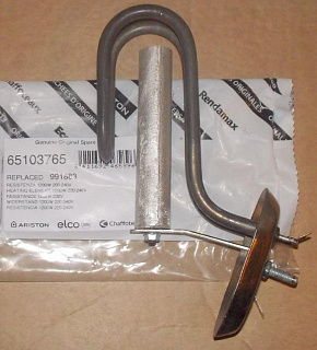 ТЭН обратнозагнутой формы длиной 140мм. Мощность - 1200W. Оболочка из нержавеющей стали. Штампованный фланец 91х65мм. Место с резьбой под анод М4. Тип контактов - клеммы. Используется в водонагревателях Ariston (Аристон): PRO R/3 10-15; PRO ST R/3 10-15; SG OR 10-15; SG UR 10-15.