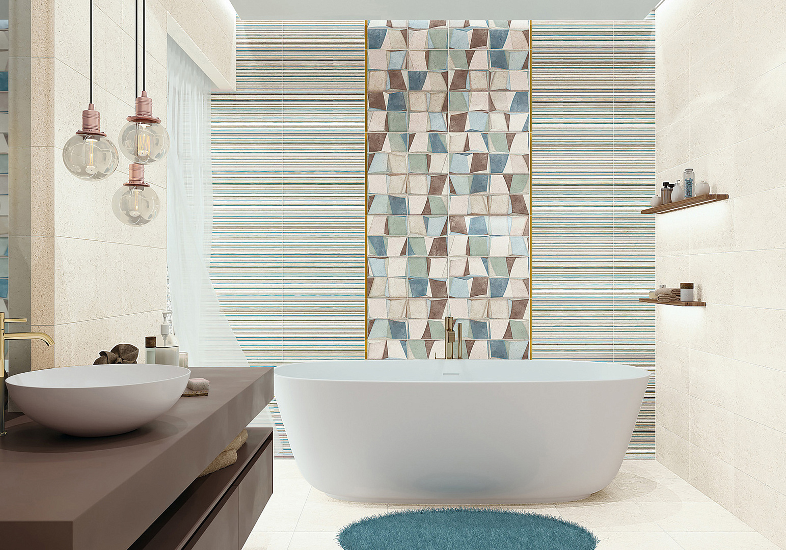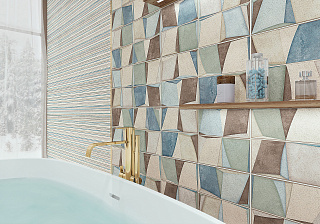 Матовая структура базовой плитки коллекции Artwork имитирует искусственно состаренный песчаник темно-бежевого оттенка. Ключевыми элементами, которые разбавят интерьер и сделают его более нарядным, являются два вида разноцветной плитки: со сложной геометрией и в тонкую полоску. Золотой бордюр-стик служит дополнительным украшением интерьера.