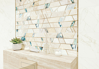 Благодаря художественному замыслу коллекция Dover объединяет природные текстуры мрамора и полудрагоценных камней. Спокойная графика матовых светлых плиток поддерживает наборный рисунок плитки с яркими вставками оникса от серого до ярко-голубого цвета. Глянцевые золотые линии на плитке красиво сочетаются с элегантным бордюром, входящим в коллекцию.
