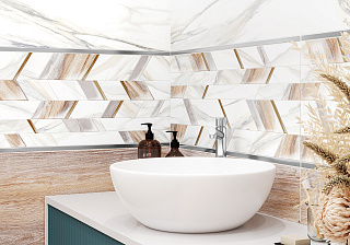 В коллекции Volcano сочетаются текстуры белого мрамора калакатта и необычного дерева с затемненными вулканическими краями. Акцентный элемент коллекции создан в виде геометричной нарезки из разноразмерных шевронов с текстурами базовых плиток. Дополнительную глубину элементов геометричной нарезки подчеркивают реакционные чернила, нанесенные по контуру сетки.