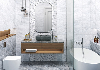 Глянцевая коллекция Liberto выполнена в холодно-голубой гамме, с классическим набором элементов — двух базовых плиток и центрального декоративного массива на рельефе. Текстура мрамора напоминает глубины океана с насыщенными сапфировыми и лазурными градиентами. Акцент коллекции — крупный мозаичный рельеф с текстурами камня и рисунками пэчворк в тон коллекции с реакционными чернилами по контурам рисунков. Коллекция произведена в формате 249×500 мм, комплектуется керамическим платиновым бордюром 13×500 мм и коллекционным лаппатированным керамогранитом формата 600×600 мм.