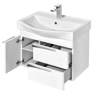 Тумба Беверли 65 в современном стиле, выполненная из влагостойкой ламинированной плиты и высококачественной MDF, обладает удобным функционалом. Слева за распашным фасадом-створкой находится вместительная ниша с регулируемой полкой из влагостойкой ламинированной плиты, а справа размещены два ящика, в которых поместятся необходимые в ванной комнате принадлежности. Петли снабжены доводчиками, а ящики - интегрированной системой плавного закрывания для комфорта и удобства потребителя. Изящные ручки в цвете глянцевый хром идеально сочетаются с линиями белоснежной керамической раковины Беверли бренда Santek. Тумба окрашена в белый цвет с высокой степенью глянца, что обеспечивает изделию привлекательный внешний вид, а также износостойкость и долговечность.