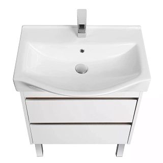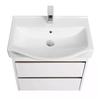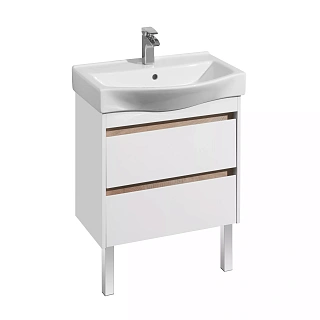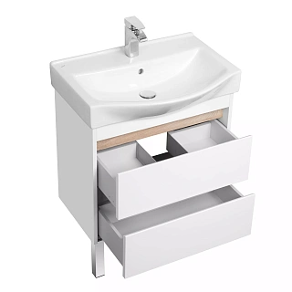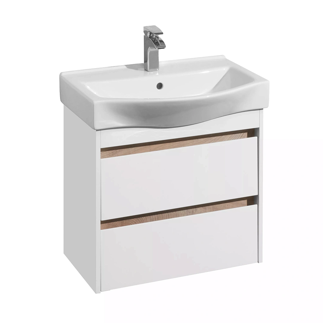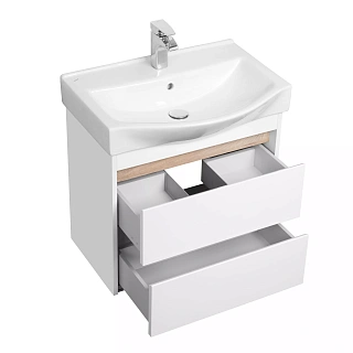 Тумба Нортон 65 в лаконичном дизайне универсальна для любого интерьера ванной комнаты. Корпус тумбы выполнен из влагостойкой ЛДСП, а фасады из МДФ в белой глянцевой покраске. Дизайн тумбы подчеркивает декоративная вставка из ЛДСП с фактурой натурального дерева дуб эндгрейн. Конструктивно тумба состоит из 2 вместительных ящиков, установленных на направляющие с доводчиками для комфортного использования. На тумбе нет выступающих деталей и фурнитуры, открытие ящиков реализовано за счет удобного выреза на фасаде. Тумба комплектуется белоснежной раковиной Беверли от бренда Santek. Тумбу можно использовать в двух вариантах: подвесную или дополнительно приобрести опоры