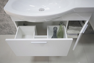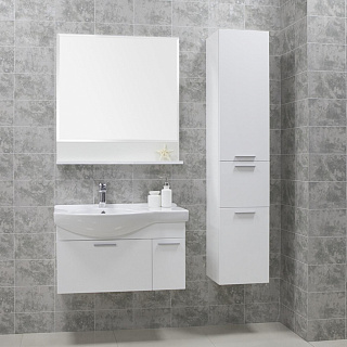 Компания АКВАТОН представляет новую коллекцию Инди 80, разработанную для тех, кто ценит комфорт и лаконичный дизайн. Все предметы коллекции характеризуются сочетанием тонких и простых линий. Тумба комплектуется керамической раковиной с большой удобной чашей. Боковая поверхность справа от чаши позволит разместить предметы, которые всегда должны быть под рукой. Плавные линии раковины повторяет полочка зеркала, на которой также можно разместить необходимые аксессуары для ванной комнаты. Большое зеркало по желанию можно дополнить светильником. Тумба очень вместительна и функциональна. Глубина ящиков без труда позволяет размещать высокие бутылочки и баночки, а встроенный механизм плавного закрывает обеспечивает мягкий и бесшумный ход ящика. За створкой фасада - дополнительное место хранение.