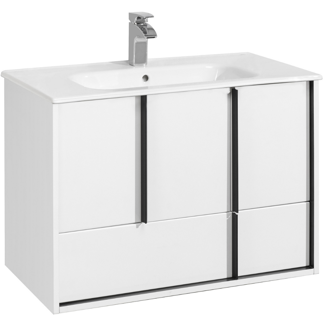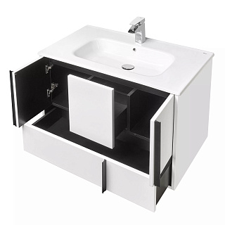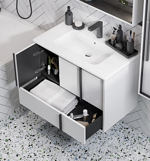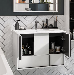 Эффектное классическое сочетание черного и белого - лаконичная и всегда беспроигрышная комбинация. Тумба Ривьера 60 выполнена из чёрной МДФ, покрытой белой матовой пленкой, что позволяет создать яркий контраст чёрного и белого. Пленка позволяет надежно защитить мебель от воздействия влажной среды ванной комнаты. Модель отличается удобной системой организации: верхний ящик тумбы оснащен системой push-to-open, справа находится распашной фасад-створка с отдельным отсеком для хранения, а вместительный нижний ящик позволит удобно расположить косметические и моющие средства. Необычные чёрные матовые ручки комфортны в использовании и подчеркивают четкую геометрию линий. Комфорт при использовании обеспечивают надежные петли с доводчиками и направляющие с системой плавного закрывания. Для комплектации тумбы идеально подойдет керамическая раковина Victoria Unik от бренда Roca.