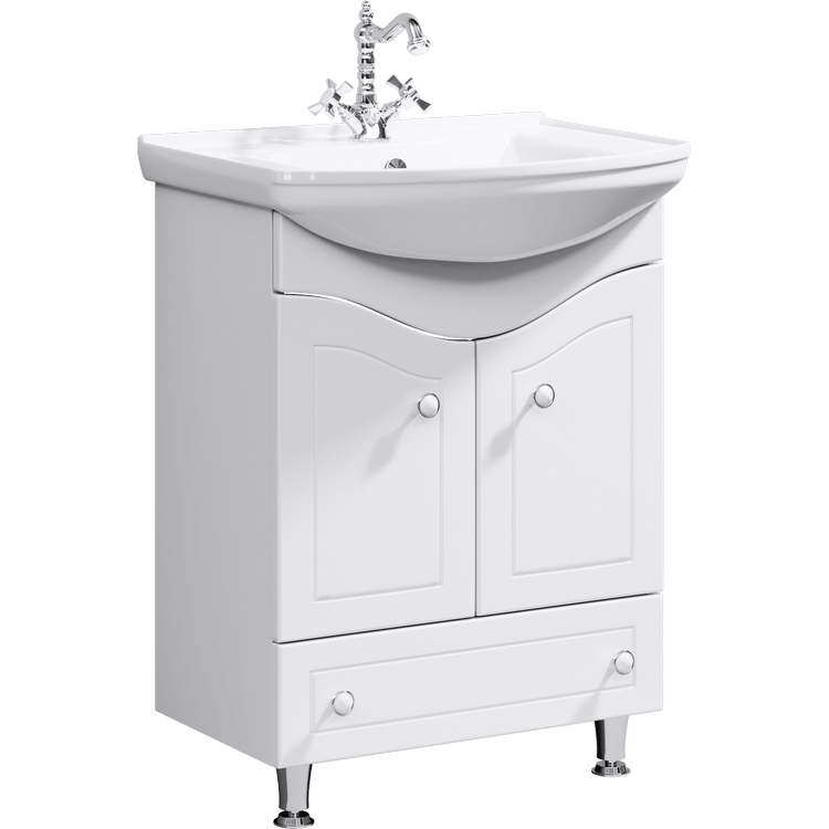 Напольная тумба с раковиной Aqwella Franchesca 65 – пример функциональной мебели для большой ванной комнаты или совмещенного санузла. Плавные волнообразные линии фасада смягчают массивность тумбы, создают ощущение мягкости и уюта.