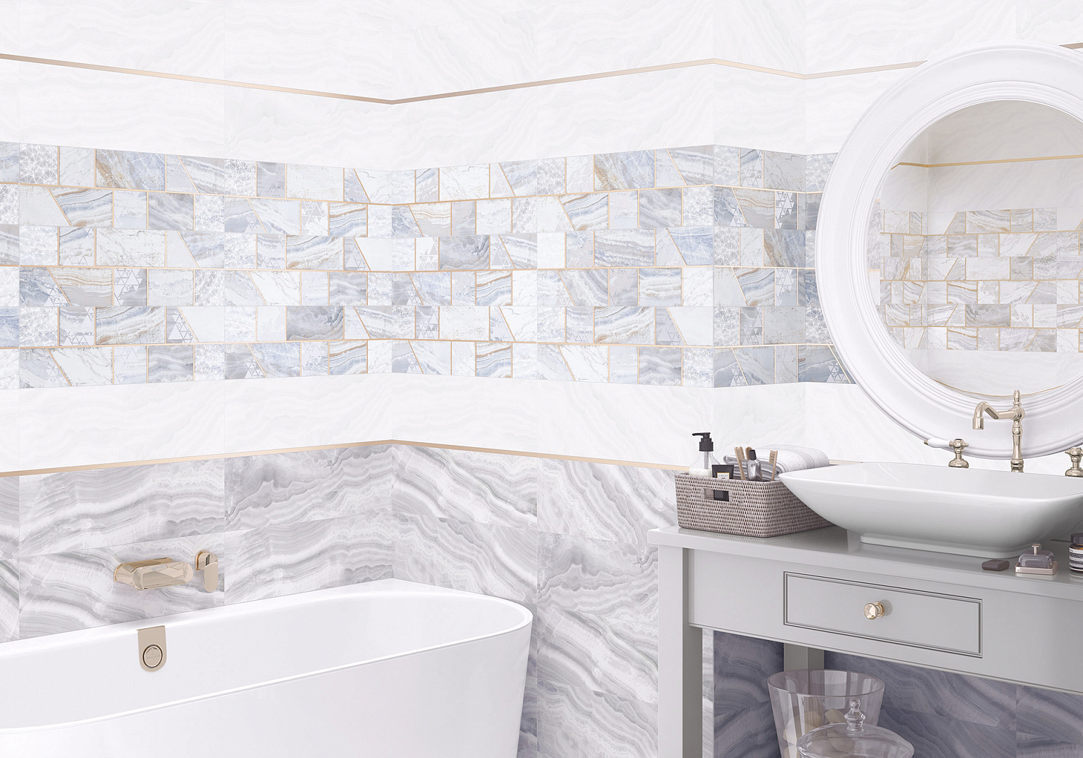 В состав этой коллекции входит 2 вида настенной керамической плитки с агрессивным оформлением поверхности. Напольная часть представлена квадратным керамогранитом в том же стиле исполнения. Прилагается декор с нарочито грубым орнаментом. Коллекция позволяет облицовывать помещения по бесшовной технологии.