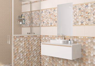Любителям веселого, насыщенного, яркого оформления помещений эта коллекция обязательно понравится. Фон всех элементов коллекции выдержан в разных оттенках бежевого цвета. Изюминкой коллекции являются декор и бордюр с пестрым мозаичным орнаментом. В напольную часть коллекции вошли два керамогранита с орнаментом и без него.
