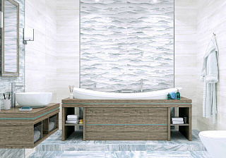 Эта коллекция позволяет облицовывать помещения в стиле эко. Все ее элементы исполнены с намеком на вид мраморной поверхности. На части настенной керамической плитки имеется орнамент. Напольный керамогранит представлен квадратной плиткой под вид мрамора светлых пород.