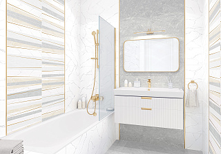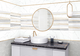 Коллекция «Байрон» вобрала в себя лучшие идеи из скандинавского стиля и минимализма. Современный дизайн коллекции объединяет легкое настроение базовых плиток мрамора сорта carrara и спокойную гармонию холодного, серого камня pulpis. Горизонтальная нарезка декоративного элемента сочетает в себе характеры баз и украшена смелыми штрихами золота и платины. Декор доступен в двух гаммах, в двух настроениях. Первый вариант декора в золотом исполнении добавит в помещение сдержанный контраст и деликатный теплый акцент. Второй вариант с платиновым блеском гармонично впишется в холодную цветовую гамму интерьера.