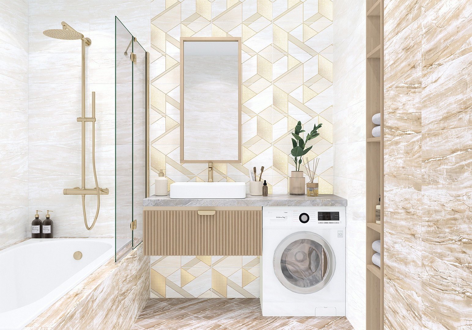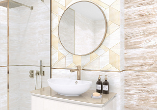 «Интерни Голд» — прочтение классики в актуальных теплых оттенках. Легкое панно лаконично, но при этом гармонично наполнено сияющими материалами: тонкие линии глиттера на золотистом металлике обрамляют зеркальный люстр и подчеркивают изящный блеск шика. Панно будет украшением и основным элементом для тех, кто любит современную классику. Коллекция дополнена базами из насыщенного текстурного камня, керамогранитом для пола 410×410 мм в тон тёмной базовой плитки и золотым бордюром Sword 13×500, который придаст эффектный шарм интерьеру.