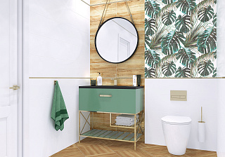 «Парадайс» — путешествие на райские острова. Данный дизайн создаёт впечатление затерянного в джунглях деревянного бунгало, укрывшегося под кружевным пологом экзотических растений. Насыщенная южная зелень панно завораживает богатыми и яркими красками. Эти живописные листья сияют люстром, подчеркнуты бронзовым металликом, а вертикальные глиттерные линии создают иллюзию тропического ливня. Декор дополнен белоснежной базой и плиткой в виде тропического дерева тик, словно согретого жарким солнцем, керамогранитом для пола с текстурой дерева и стильным бордюром Sword Gold.