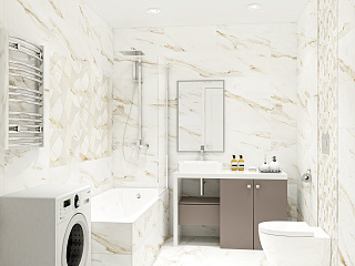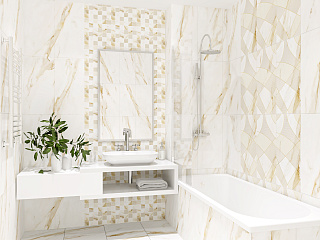 Благородный узор Calacatta Royal Geometria гармонично декорирует как просторные интерьеры, так и добавит зрительного объема и легкости уютным небольшим ванным комнатам. Calacatta Royal Geometria декорируется золотом, эффектно подчеркивая форму рисунка, создавая плавные линии, шиммирингом и золотым металликом, отсылая нас к технике patchwork.