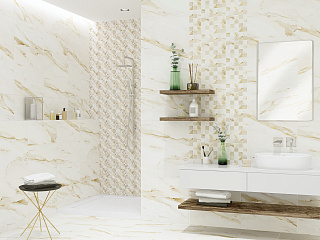 Красоту коллекции дополняет декорированная керамическая мозаика, подчеркивая неповторимую интерьерную композицию с золотистыми вкраплениями шиммиринга.