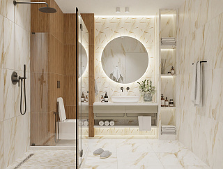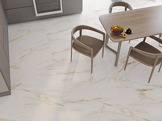 Графика плиты Calacatta Royal воспроизводит естественную текстуру натурального камня с тонкими разноцветными прожилками бежевых и золотистых оттенков. Для мрамора цветовая характеристика и рисунок камня выходят на первый план, поэтому мы реализовали десять различных фрагментов в полотне Calacatta Royal, что позволит подчеркнуть богатство рисунка в интерьере, особый шарм и неповторимость. Теплые оттенки на сатинированной глазури плиты создают элегантный блеск, оживляют и освежают пространство.