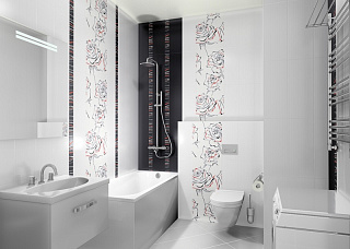Коллекция позволяет оформить ванную комнату в черно-белых тонах, которые лишь слегка разнообразят цветные вкрапления на панно, изображающих крупные розы и на узких бордюрах с вертикальными полосками разных цветов. Сдержанное цветовое решение привносит в ванную комнату спокойную торжественность и шик.