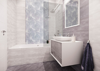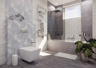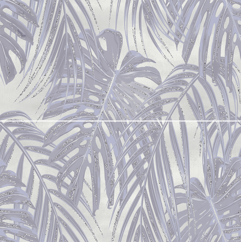 В этой коллекции удивительным образом совместились тропические мотивы с грубостью бетонной поверхности. К этому добавляется перламутровое мерцание уникального панно и прекрасное дополнение в виде мозаики и бордюров платинового цвета. Комбинация этих элементов позволяет сделать интерьер разнообразным и красивым.