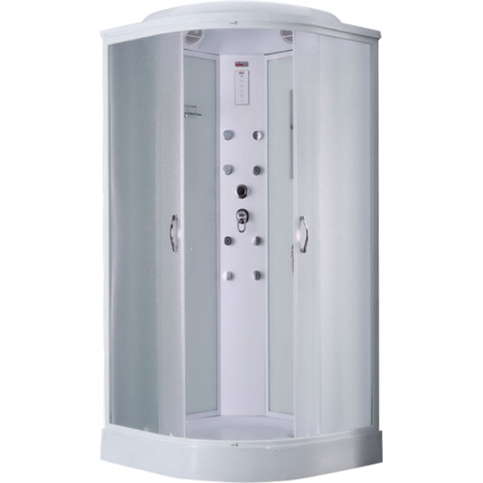 Размеры 900x900x2180, высота поддона 150 мм, матовые структурные стекла, верхний душ (тропический ливень), встроенный однорычажный смеситель TIMO с трехрежимным переключателем на верхний душ, душевую лейку, гидромассажные форсунки, хромированный смеситель, зеркало, сенсорный пульт нового поколения с функциями включения/выключения, FM-радио, верхний свет, вентиляция, безопасное напряжение на выходе 12 V. Быстрая безсиликоновая сборка.