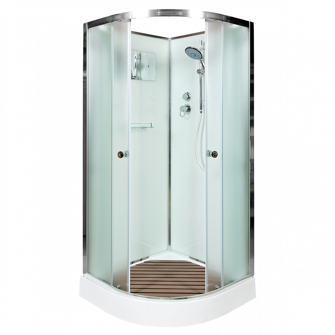 • Усиленный акриловый поддон высотой 15 см, антискользящая вставка из антибактериального полимера имитирующего дерево (включена в стоимость душевой