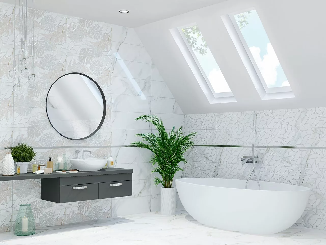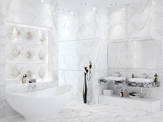 Эта коллекция ориентирована на любителей роскошного стиля в облицовке помещений. Сюда вошли 2 вида настенной керамической плитки и 1 вид напольного керамогранита. И та, и другая плитка стилизована под вид мрамора светлых пород. Прилагаются два панно с цветочным орнаментом и декор с ненавязчивым узором.