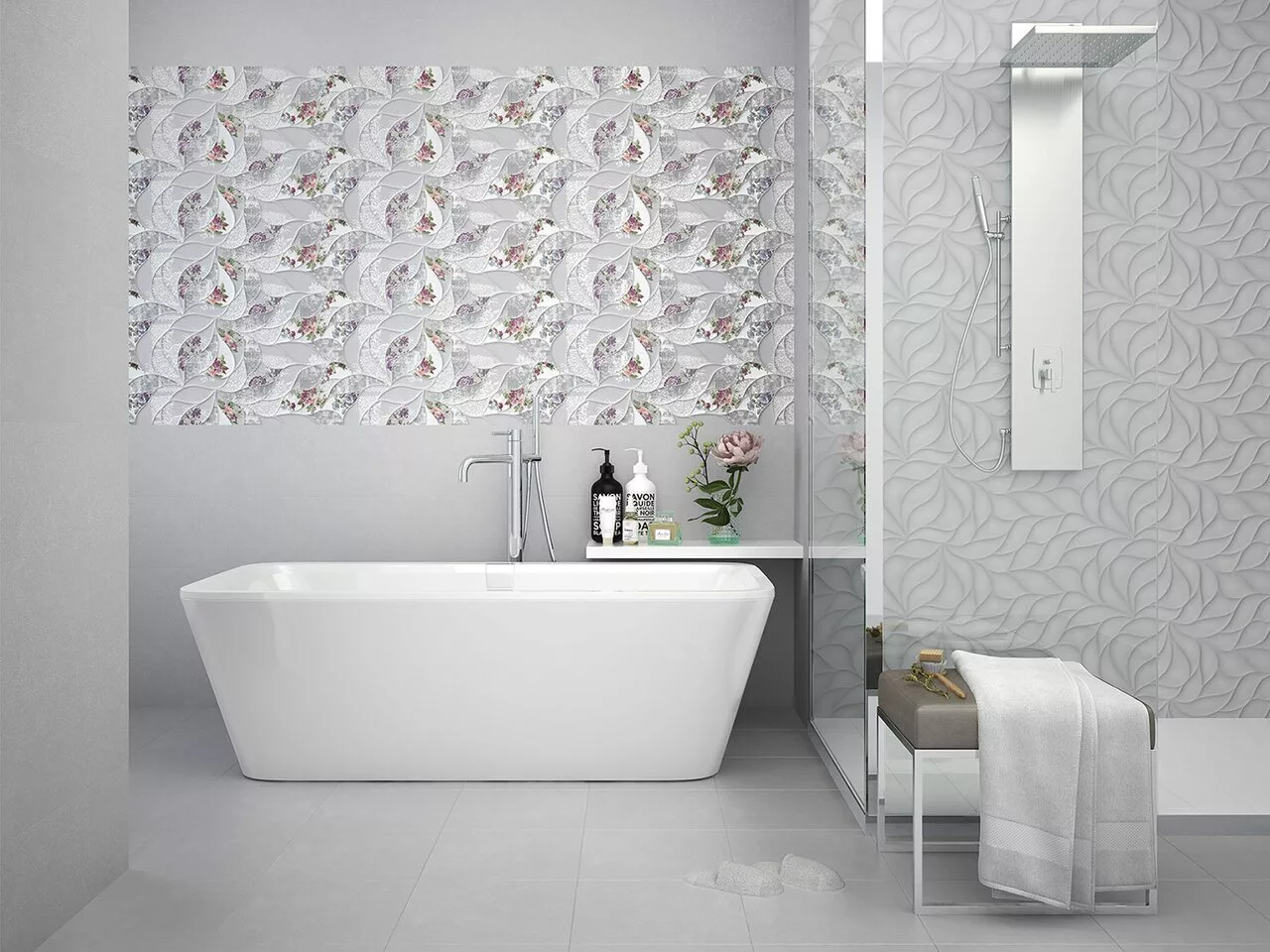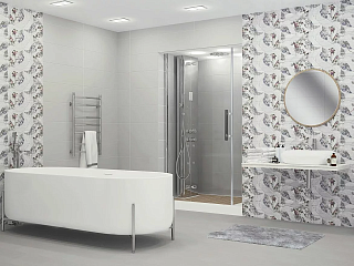 В составе этой коллекции 4 вида настенной керамической плитки, один из которых имеет ровный серый окрас. Три оставшихся вида украшены цветочными орнаментами и узором в виде тиснения по штукатурке. Напольный керамогранит имеет ровную поверхность розового и кремового цветов. Прилагаются 2 декора с густыми мозаичными орнаментами.