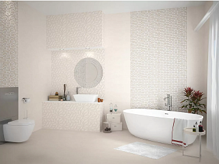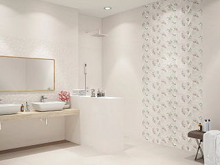 В составе этой коллекции 4 вида настенной керамической плитки, один из которых имеет ровный бежево-розовый окрас. Три оставшихся вида украшены цветочными орнаментами и узором в виде тиснения по штукатурке. Напольный керамогранит имеет ровную поверхность розового и кремового цветов. Прилагаются 2 декора с густыми мозаичными орнаментами.