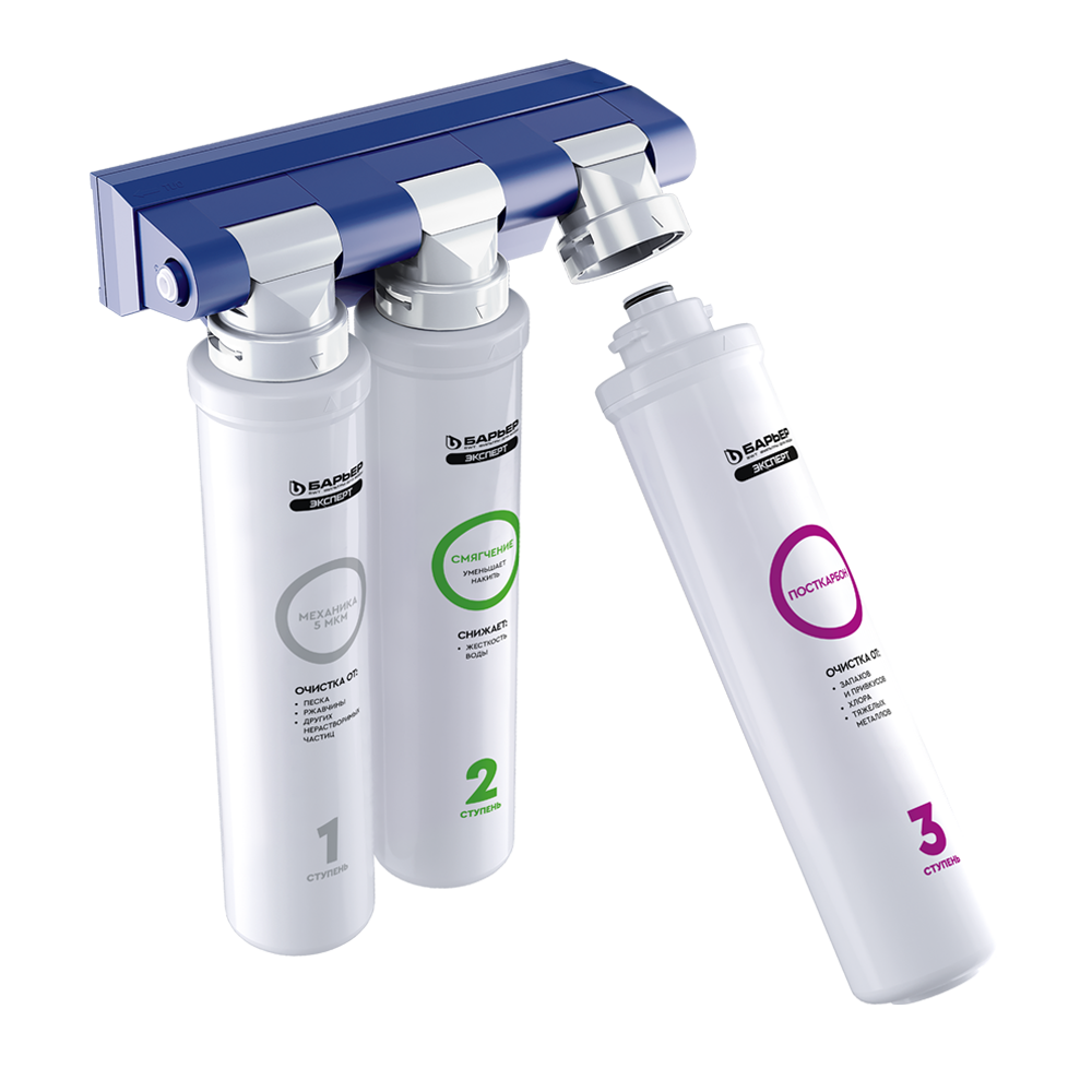 3."БАРЬЕР ЭКСПЕРТ ПостКарбон" - финишная очистка и кондиционирование, устранение неприятных привкусов и остаточного хлора. Ресурс - 10 000 литров.