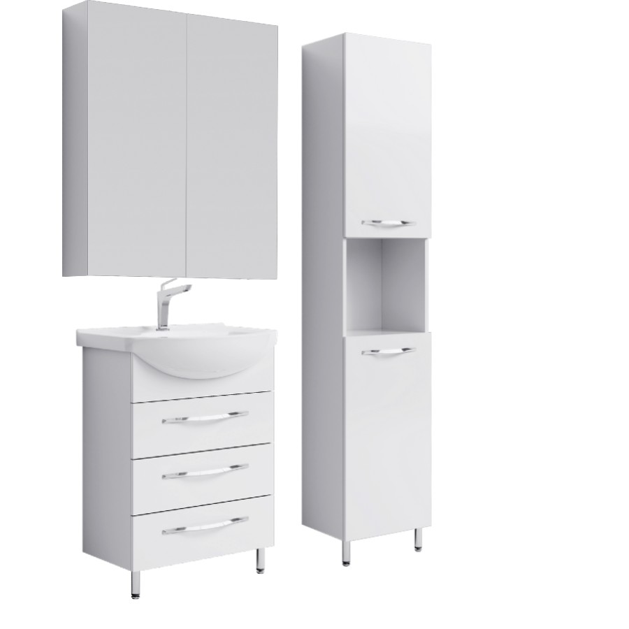 СОСТАВ КОМПЛЕКТА: ТУМБА С РАКОВИНОЙ, ШКАФ-ПЕНАЛ, ЗЕРКАЛО-ШКАФ.