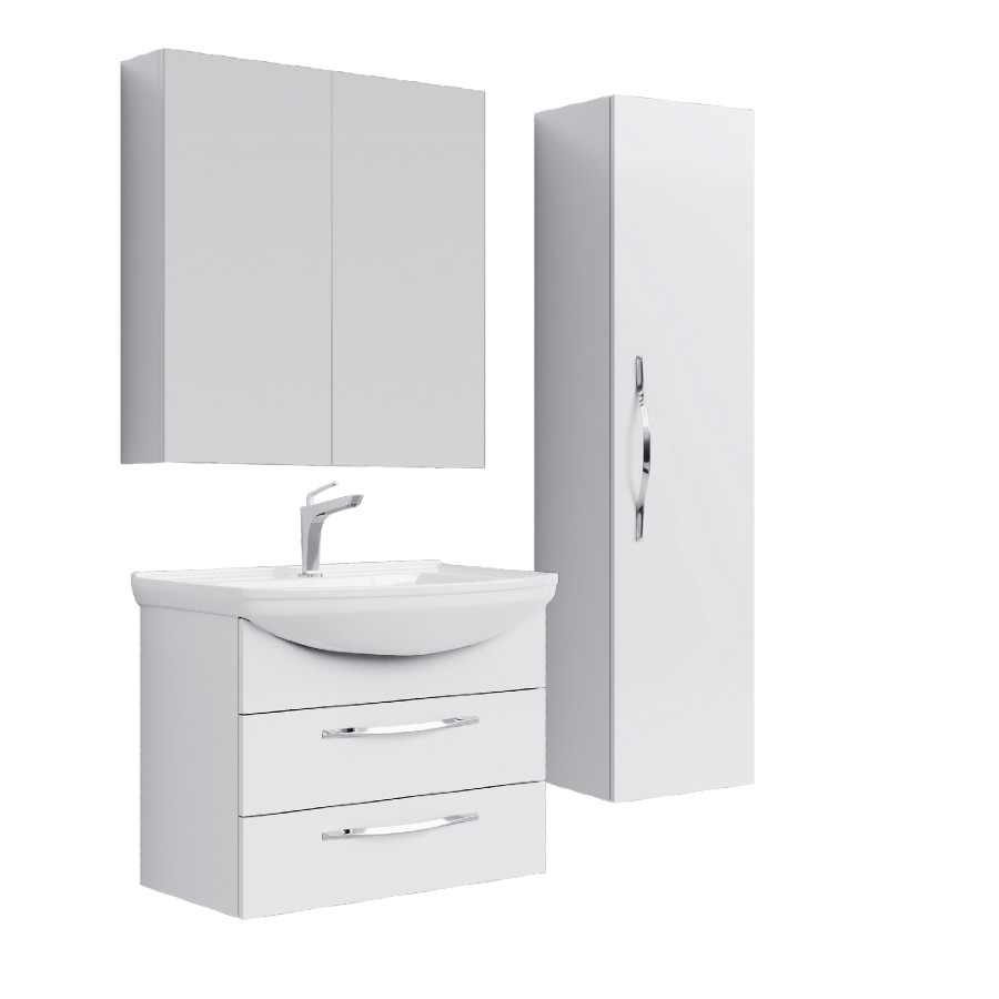 СОСТАВ КОМПЛЕКТА: ТУМБА С РАКОВИНОЙ, ШКАФ-ПЕНАЛ, ЗЕРКАЛО-ШКАФ.