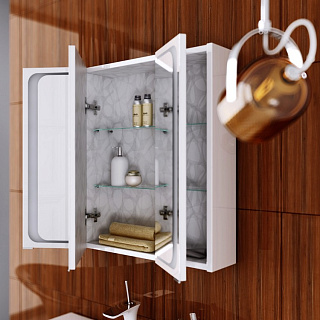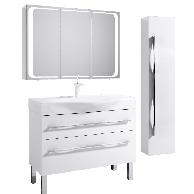 СОСТАВ КОМПЛЕКТА: ТУМБА С РАКОВИНОЙ, ШКАФ-ПЕНАЛ, ЗЕРКАЛО-ШКАФ.