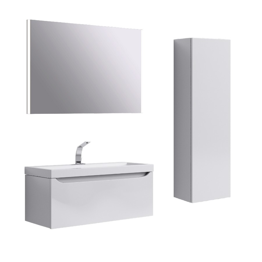 СОСТАВ КОМПЛЕКТА: ТУМБА С РАКОВИНОЙ, ШКАФ-ПЕНАЛ, ЗЕРКАЛО С ПОДСВЕТКОЙ.