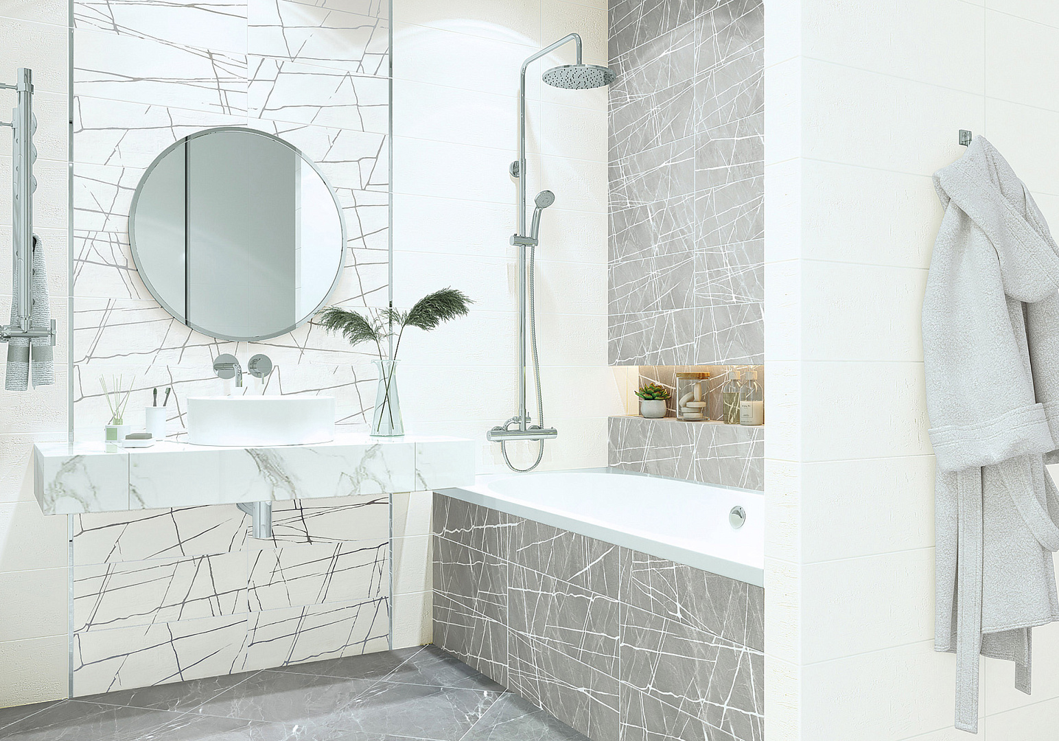 Коллекция Chicago Gray — это реалистичная текстура камня с прожилками, имитирующими природный сланец. А бархатистая поверхность и два контрастных цвета плитки, которые дополняются белой базовой плиткой и платиновым бордюром, создадут интерьер в экостиле.