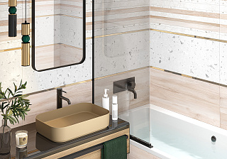 Современное сочетание терраццо, бетона и дерева для тех, кто не боится экспериментировать. Глянцевая поверхность плиток дополнена спецэффектом матовых чернил, которые создают на поверхности сатиновую текстуру и объём. За счет этого бетонно-каменная поверхность получается сложной с интересным сочетанием глянцевой и матовой поверхности. Плитка с текстурой древесины нюдовых оттенков является мягким акцентом коллекции.