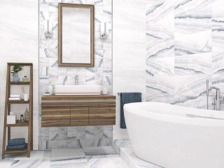 «Атлантик» — это волны океана, застывшие в камне. Глянцевая текстура плитки в холодных стальных и дымчато-голубых цветах идеально передает мельчайшие оттенки драгоценного агата. Акцентом коллекции является плитка с градиентным переходом каменной текстуры от светлых к тёмным тонам. Украшением коллекции является геометричный элемент в виде квадратов, которые востребованы в современном дизайне. Технология реакционных чернил придаёт графике объем и глубину, а текстуре камня иллюзию движения воды и изысканный перелив. Разнообразие этих элементов позволяет смоделировать пространство на любой вкус.