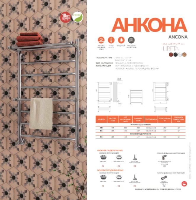 Водяной полотенцесушитель Анкона с полкой – изящная модель, которая украсит интерьер ванной комнаты, поддержит идеальную температуру в помещении. Высота изделия варьируется в пределах 616–826 мм, количество перекладин составляет от 6 до 8 штук. Для производства полотенцесушителя используется только высококачественная нержавеющая сталь марки AISI 304L с высоким содержанием легирующих элементов, Ni и Cr, это позволяет изделиям сохранять стойкость к агрессивным коррозийным средам, что существенно продлевает срок их эксплуатации. Толщина стенки используемой трубы не менее 2 мм, это обеспечивает 10-ти кратный запас прочности, труба устойчива к резким перепадам давления в системе водоснабжения!