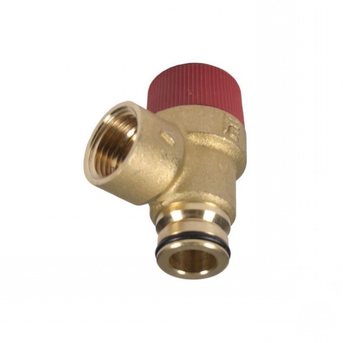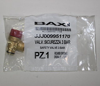 Предохранительный сбросной клапан газового котла Бакси EcoFour (9951170). Данное устройство, настроенное на 3 бар, установлено в контуре отопления и стравливает воду, если давление в данном контуре превышает заданное значение. Рекомендуется подсоединить предохранительный клапан к сливу через сифоны (воронки).