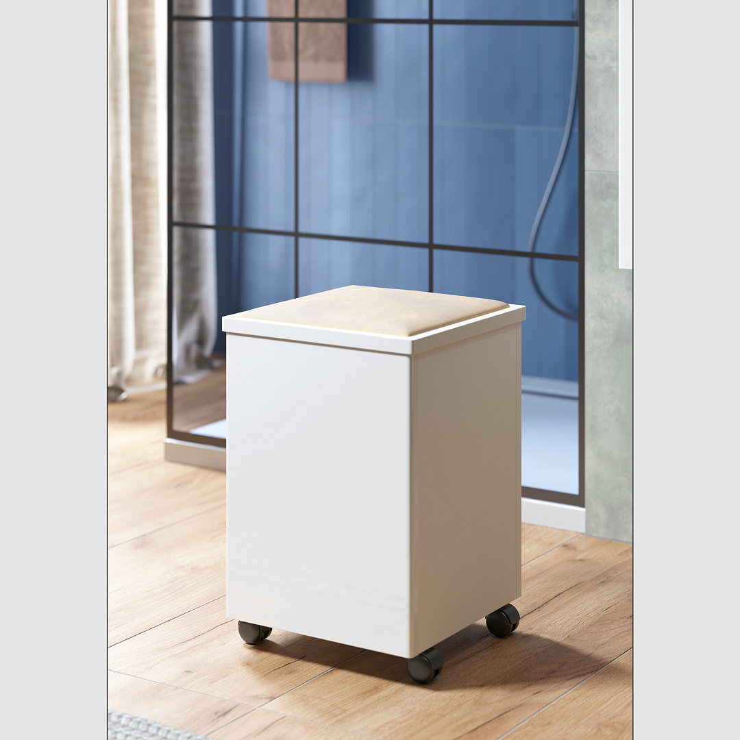 Пуф для ванной Универс (размер 30 см) белого цвета идеально дополняет навесной шкаф-пенал Univers, создавая удобный и функциональный гарнитур. Пуф на колесиках легко передвигается. Сверху имеется съемная крышка со вставкой из искусственной кожи.