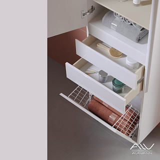 Два верхних распашных фасада пенала с двумя переставляемыми полками внутри, которые изготовлены из ДСП «Интерьерный лен», удобны и практичны для хранения различных принадлежностей. Затем идут два выдвижных ящика для хранения мелочей и внизу – откидной фасад с корзинкой для белья.