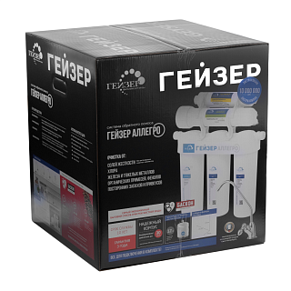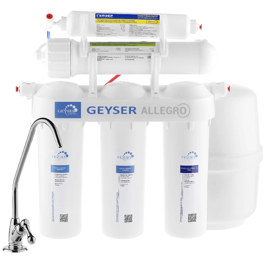 Фильтр Гейзер Аллегро работает по принципу обратного осмоса. Фильтрация воды осуществляется через мембрану, поры которой пропускают только молекулы воды и кислорода. Так как размер молекул большинства примесей, а также бактерий и вирусов значительно больше молекул воды, мембрана успешно задерживает их. Накопительный бак выполнен из прозрачного пластика и имеет сменные мембраны с антибактериальным покрытим, поэтому скорость размножения микроорганизмов в 1000 раз по сравнению с классическими накопительными баками.