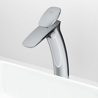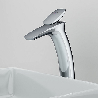 Наклон и плавный изгиб высокого корпуса смесителя с одной стороны придают неповторимую динамику дизайну, с другой — обеспечивают удобство использования на раковине с глубокой чашей.