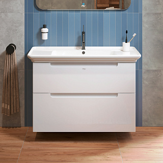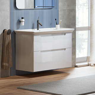 Объемная белая современная тумба с раковиной Berta 105 сочетает в себе практичность, функциональность, изящество стиля и высокое качество. Тумба украсит просторную ванную комнату, в отделке которой использованы современные или классические стили интерьера.
