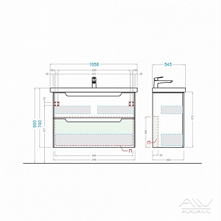 В тумбе Берта 105 имеются два вместительных выдвижных ящика на направляющих с доводчиками, которые внутри отделаны фирменным материалом – интерьерный лен и укомплектованы съемными делителями. Ящики позволят практично организовать хранение необходимых принадлежностей и бытовой химии.