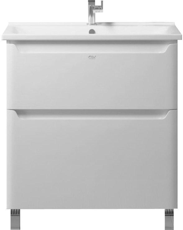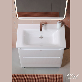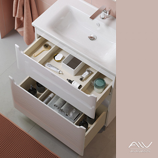Белая тумба с раковиной Lana 80 с гладким фасадом и двумя выдвижными ящиками с декоративными зацепами является образцом современного дизайна, практичности и функциональности. Вместительные ящики из ДСП с применением фирменного материала Твист, с удобными доводчиками плавного закрывания, позволят разместить в них все необходимые принадлежности в ванной комнате.
