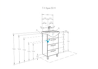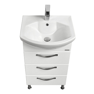 Комплектация: Раковина Смайл 50 - 1 шт., Ручка - 3 шт., Ножки - 2 шт., Регулируемый навес - 2 шт., Выдвижной ящик (направляющие с интегрированной системой плавного закрывания) - 3 шт., Тумба - 1 шт.