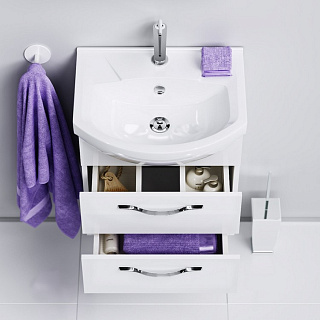 Тумба с раковиной Aqwella Allegro 50 подойдет для большой ванной комнаты в современном стиле. Для усиления конструкции применяются навесы фирмы CАMAR (Италия) с ответными планками. Они выдерживают нагрузку до 200 кг. Подвесной монтаж и белый глянец визуально облегчают конструкцию и привносят в пространство ощущение чистоты и света. При производстве изделия используются экологически чистые технологии и влагостойкие материалы. Фасад изготовлен из МДФ, корпус – из ДСП. Качественное покрытие эмалью защитит мебель от царапин и устойчивых пятен. Тумба укомплектована массивной фарфоровой раковиной и двумя выдвижными секциями. Подвижные элементы оснащены скрытыми направляющими австрийской фирмы Blum с системой мягкого закрывания. Ящики на таких направляющих рассчитаны на динамическую нагрузку до 30 кг.