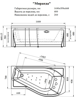 Акриловая ванна "Миранда" 168х95 – удачный микс прямоугольной и угловой ванны. Изгиб передней части обеспечивает широкую зону спины и увеличенное пространство для принятия душа, а зауженная часть в области ног шириной 70 см позволяет установить раковину прямо над ванной, максимально сэкономив место. Ванна, сужающаяся в ногах, - креативный и практичный подход для обустройства малогабаритных санузлов.