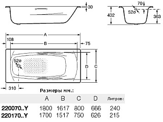 Ванна стальная Roca Princess 170x75 2,5 мм (в комплекте ручки, ноги)